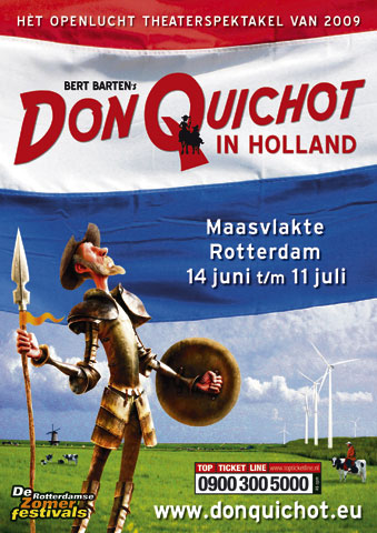In het theaterspektakelstuk ‘Don Quichot in Holland’ strijdt de licht getikte Spaanse edelman samen met zijn corpulente hulpje Sancho Panza op de winderige Maasvlakte voor schone windenergie. Helaas is het toneelstuk een slap aftreksel van het boek.