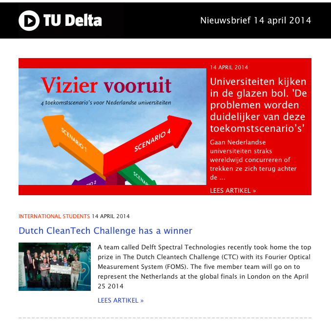 Iedere maandagmiddag valt de Delta nieuwsbrief in je inbox, als je je tenminste hebt aangemeld via www.delta.tudelft.nl/aanmelden. In de nieuwsbrief praten we je wekelijks bij met een overzicht van alle artikelen die de afgelopen week op de website van Delta verschenen.