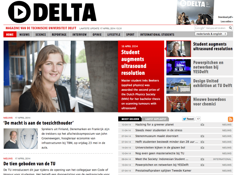 Onze site delta.tudelft.nl wordt dagelijks geüpdatet met nieuws over de TU Delft en ontwikkelingen op het gebied van wetenschap en onderwijs. Daarnaast staan alle artikelen uit de papieren Delta op de site, zodat je ze makkelijk via social media kunt delen. De website is niet alleen goed te lezen op je desktop, maar ook op smartphones. Wil je het papieren Delta magazine liever als PDF of online-blader-editie lezen? Klik dan op de link rechtsboven op de homepage.
