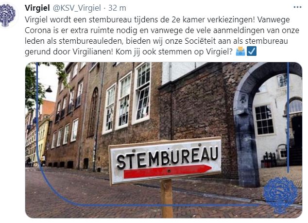 De sociëteit van Virgiel is dit jaar voor het eerst een stembuslocatie tijdens de verkiezingen voor de Tweede Kamer. De studentenvereniging twittert trots dat vele leden zich hebben aangemeld als stembureaulid. De gemeente Delft bevestigt dat, maar laat nog in het midden of het stembureau volledig door Virgilianen zal worden bemenst. Op de TU-campus zal de aula dit jaar niet één maar twee stembureaus huisvesten. Normaal is het tweede stembureau te vinden in het gebouw van Elektrotechniek, Wiskunde en Informatica. Volgens een gemeentewoordvoerder is dat pand minder geschikt bevonden voor coronaproof verkiezingen. Het stembureau Virgiel is alleen op de officiële verkiezingsdatum 17 maart geopend. In de aula kunnen mensen op 15, 16 en 17 maart terecht. (SB)