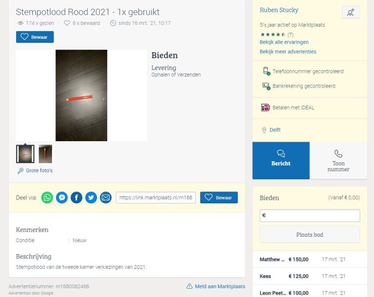 In a number of municipalities, voters are allowed to take the red pencil home with them to avoid contamination with the coronavirus. This is unique, because it is the first time that the voting pencils are not left behind at the polling stations. A voter from Delft saw a business opportunity in the collector’s item and put the pencil up for sale on the Marktplaats trading platform. The pencil appears to be in demand, the advertisement ‘Voting pencil Red 2021 – 1x used’ has been viewed 257 times and the highest bid is now at EUR 155. (MvdV)