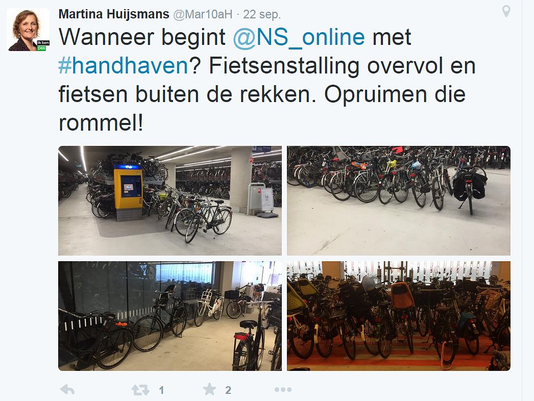 In een persbericht spreekt D66-raadslid Martine Huijsmans van ‘een situatie waar de gemeente Delft en de NS niet trots op mogen zijn’. Eerder twitterde ze al over de stalling. Zoals op 21 september: “Lange rij voor fietsenstalling van Delft CS. Fietsers mogen er niet in door 1000 fout geparkeerde fietsen! Begin van het einde?”