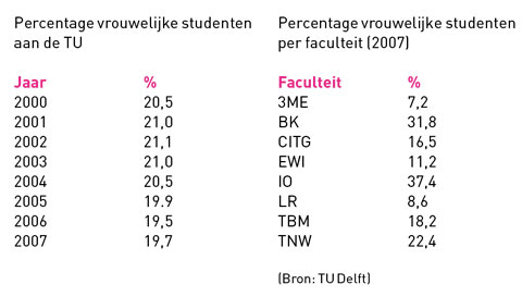 Twintig jaar later, in 2002, studeren 2779 vrouwen aan de TU Delft. Dat is 21 procent van het totaal. Een hoogtepunt, want in de jaren daarna daalt het percentage tot iets onder de twintig procent. Pas in 2007 wordt deze negatieve tendens weer doorbroken. Hoe zit het met de verschillende faculteiten? Een eerste blik op de cijfers van vorig jaar leert dat Industrieel Ontwerpen het grootste aandeel vrouwen aan boord heeft (37,4%), gevolgd door Bouwkunde (31,8%) en Technische Natuurwetenschappen (22,4%). Aan de onderkant van de lijst zou Luchtvaart- en Ruimtevaarttechniek zich hard moeten maken voor een retourtje Venus, want het aandeel vrouwen houdt hier nog niet over (8,6%). 3mE sluit de rij met 7,2%, maar kon ten opzichte van 2006 een klein procentje erbij optellen. Een bemoedigende score dus.