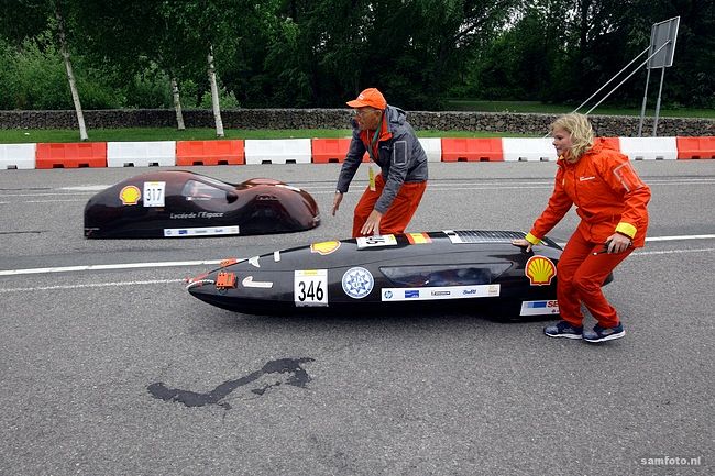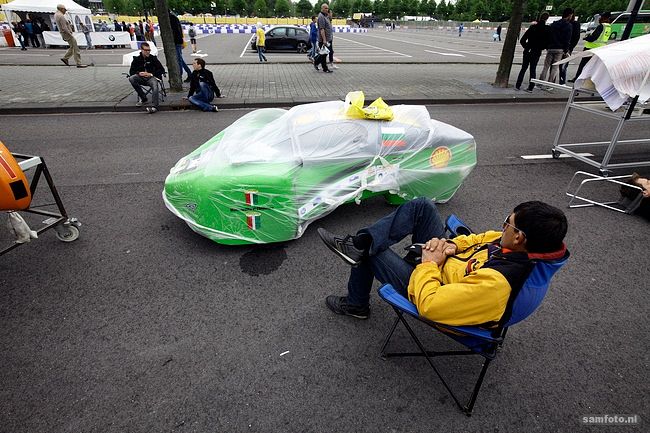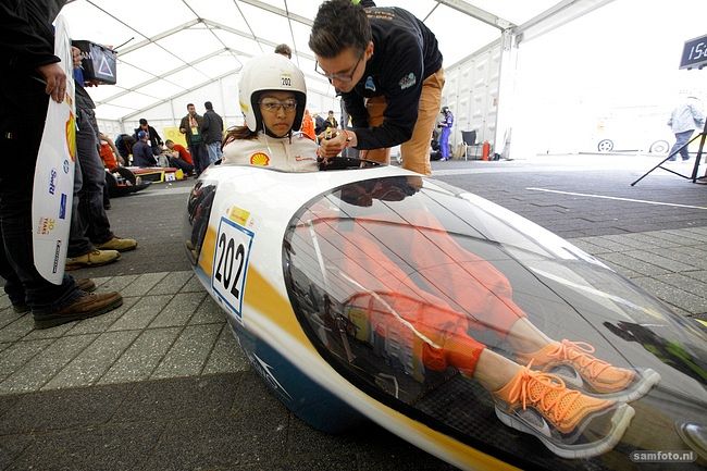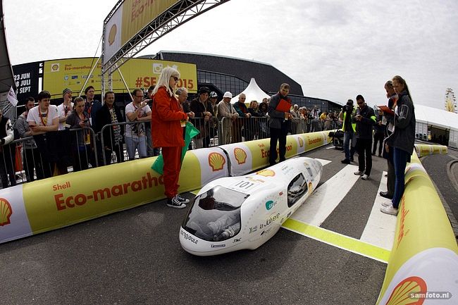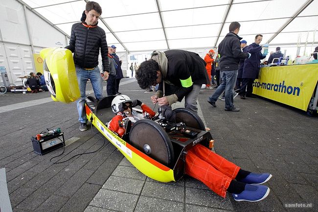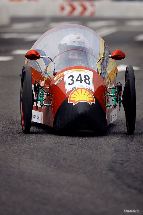 Rotterdam en daarbij zo min mogelijk brandstof verbruiken. Eerder die dag reden andere teams met conventionelere voertuigjes, waar je fatsoenlijk in en uit kunt stappen; de zogenoemde UrbanConcept-wagens.