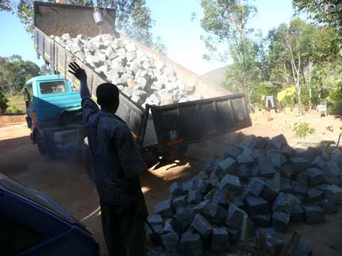 De grondstoffen verzamelden de ingenieurs zelf uit de wijde omtrek. “Dat was heel gaaf”, zegt Dikkers. “We haalden alles op met een oude dikke Mercedestruck. Soms reden we met dertigduizend bakstenen. Dan weer met honderddertig zakken cement. En alles kwam direct van de bron. Gruis voor het cement haalden we bij de steengroeve.” “En”, valt Schrama bij, “zand haalden we bij de zandmannetjes. Die schepten het op uit de rivier en brachten het met emmers naar onze truck.” Dikkers: “Dat soort dingen zie je niet in Nederland als je bouwt.”