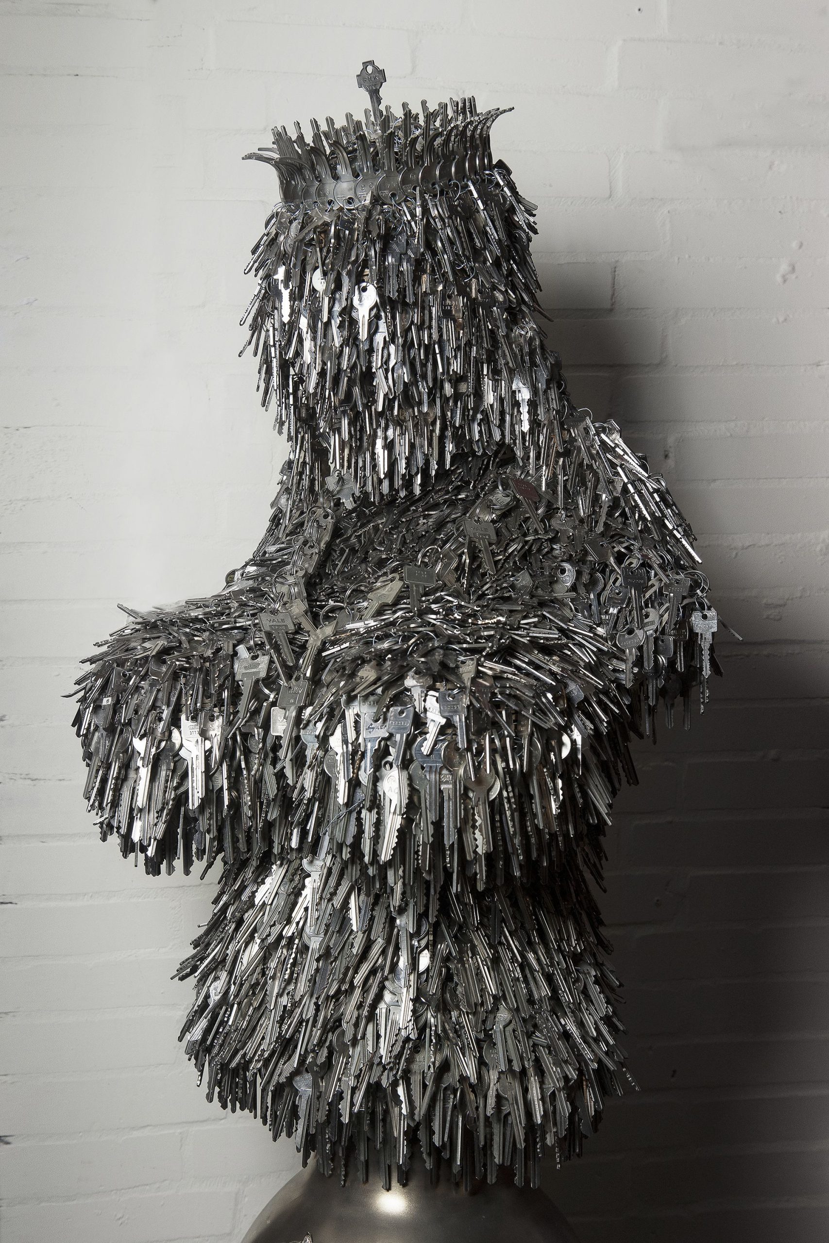 Geijp decided to make a key figure to present at De Verbeelding in 2003, a cultural event in Pijnacker-Nootdorp. As a basis he started with the case of an old navigation system, with a welded frame mounted upon it. Waste perforated steel strips were used to hang the key rings on. “It was nice work you could get lost in whilst building,” he said. “So the key figure slowly took shape.” It took approximately four weeks for Geijp to complete the piece.