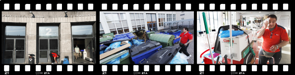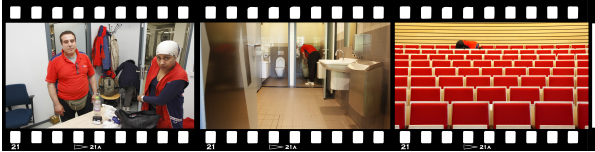 Om kwart over acht stapt Akkoc de portiersloge in. Vriendelijk tilt hij telefoons en toetsenborden op om de bureaus te poetsen. Iedereen maakt ruimte. Af en toe maakt de schoonmaker een praatje met de mensen die hij tegenkomt. Hij houdt wel van een geintje, vertelt hij. “Maar sommige mensen zeggen niet eens hallo”, zegt hij, spijtig zijn schouders ophalend.