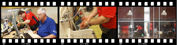De schoonmakers zijn sinds de laatste openbare aanbesteding, nu vier jaar geleden, in dienst van vier grote schoonmaakbedrijven: GOM, CSU, Hectas en Asito. CSU zit bijvoorbeeld in de universiteitsbibliotheek en de aula, GOM maakt onder meer de faculteiten IO en 3mE schoon. Zo zijn alle gebouwen over de vier verdeeld. Het contact tussen de schoonmaakbedrijven en de TU verloopt via de dienst facilitair management en vastgoed (FMVG), zowel bij het maken van werkafspraken en het sluiten van contracten als op de werkvloer.