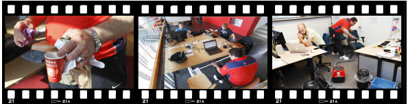 “Stress? Nee, daar houd ik niet van”, lacht Akkoc tijdens de koffie. Hij draait op routine. “Meestal werk ik gewoon wat langer door dan tot drie uur. Tot mijn werk af is.” Nu met de verbouwing ligt er sowieso overal meer stof. Moppen en stofzuigen zijn klussen waar hij veel tijd in steekt. Maar eerst moet hij steeds weer propjes, bekers en andere rommel weghalen. Een oude taartdoos met nog één stuk vlaai erin bijvoorbeeld. “Lekker taart”, lacht Akkoc terwijl hij de doos in zijn schoonmaakkar gooit. Het duurt nog even voordat hij mag gaan eten. In de kelder van IO.