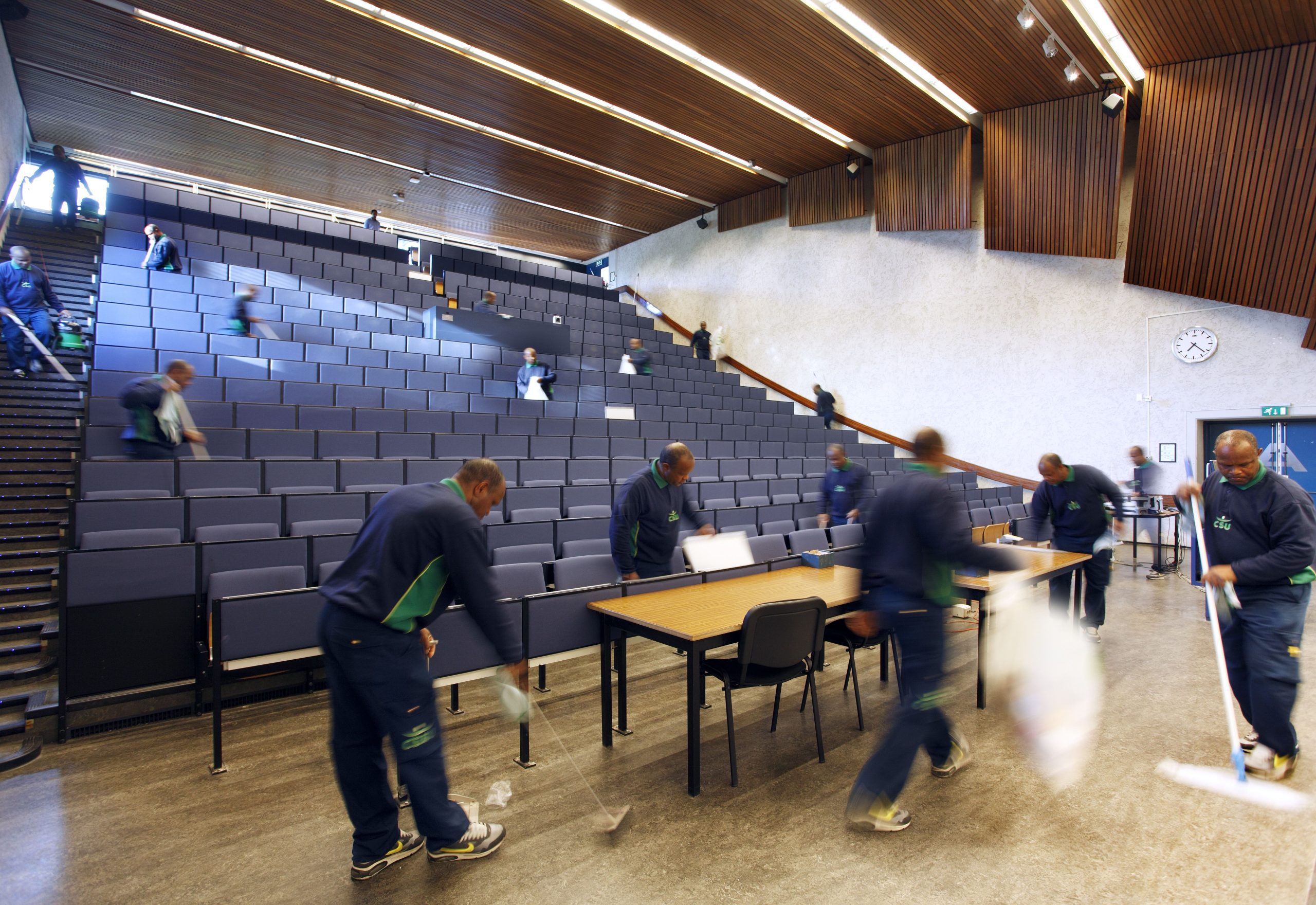 Gewapend met vakbondsshirts en actieborden lopen zo’n dertig schoonmakers op 28 mei 2013, een zonovergoten dag, van de aula naar het kantoor van het college van bestuur aan de Drebbelweg. Ze eisen respect van de universiteit. Die is niet hun werkgever, maar wel de opdrachtgever waar ze soms al veertig jaar werken.