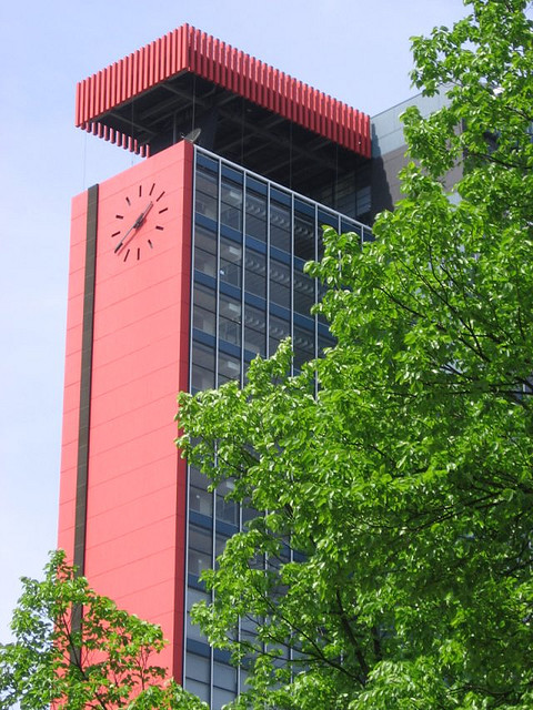 But not all days are so windy that you can’t enjoy what the faculty has to offer. A March 2013 introductory video of the EEMCS faculty follows the path of a student who finds herself transported within Delft between the city’s two tallest buildings. She spots the EEMCS building from the Nieuwe Kerk, as a beam of energy sends her a signal that takes her on a trip through virtual reality. (Oddly enough, the video says how tall the Nieuwe Kerk is but never mentions the height of the EEMCS building.)