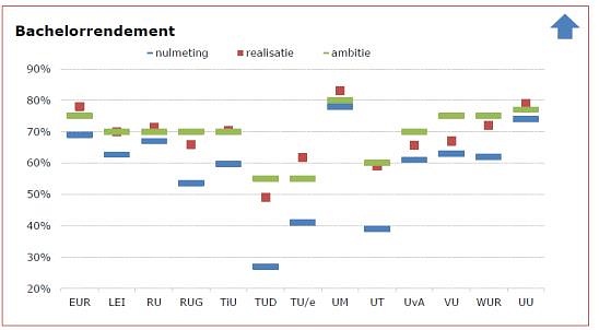 Uit de ‘VSNU Jaarreportage prestatieafspraken 2014’ blijkt welke universiteiten dat zijn. De Erasmus Universiteit Rotterdam had de afspraken over bachelor-rendement (nominaal plus 1) eind 2013 al gehaald, net als de Radboud Universiteit, de TU Eindhoven en de universiteiten van Maastricht en Utrecht. De Amsterdamse universiteiten en de TU Delft lijken daar meer moeite mee te hebben. De precieze cijfers zijn niet duidelijk want de VSNU mag alleen landelijke cijfers naar buiten brengen, laat een woordvoerder weten.