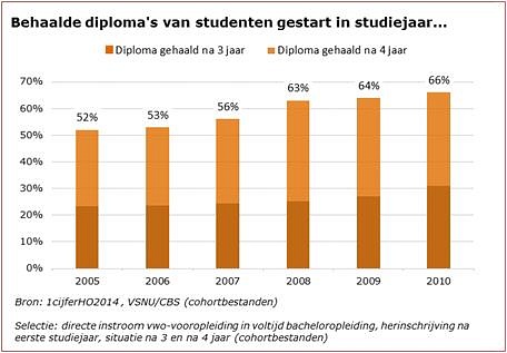 Twee van de drie studenten die in 2010 begonnen, hadden binnen vier jaar een bachelordiploma op zak. Slechts 31 procent lukte dat in de drie jaar die er officieel voor staan. Toch is dat een verbetering. Van de groep die in 2005 begon, haalde maar 52 procent binnen vier jaar de eindstreep.