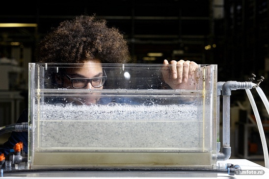 Terug in het Delftse waterlab, waar Steef de Valk goed bekend is met de Friese reactor – hij liep er stage bij Tamis. De Delftse wormen (tubifex) leven op roosters die aan een kant van de testreactor in het rioolwater hangen. Het ‘voedsel’ krijgt De Valk van de afvalwaterzuiveringsinstallatie Harnaschpolder. Het zwarte water zit in een goed afgesloten jerrycan. De proefreactor heeft een middenscheiding en bestaat uit twee gescheiden helften die identiek zijn, op de aanwezigheid van de wormen na. Zo kan hij precies meten wat de invloed van de wormen is. Want daar waren in Wolvega al vragen over gerezen: waren de wormen verantwoordelijk voor de onverklaarbare afbraak, waren het de bacteriën in hun darmen of was het een enzym dat één van de partijen aanmaakte? De Valk: “We weten dat wormen de afbraak versnellen en dat ze tijdens de vergisting de productie van biogas verhogen doordat ze zelf uiteenvallen in de vergister. Maar wat is de verklaring in termen van enzymen? Als we dat weten, kunnen we het enzym maken met een gemodificeerde bacterie. Als je dat enzym toevoegt tijdens de vergisting ben je ook klaar.”