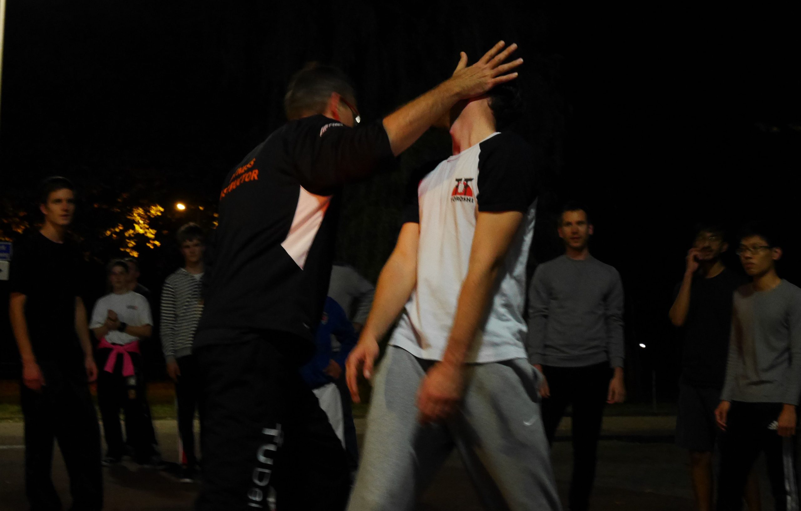 Nadat ze zijn warm gedraaid, dirigeert Van Wijgaarden hen onder meer naar de Keverling Buismanweg achter de D:Dreamhall. Hier, in het donker, werken ze elkaar tegen de muur van een anoniem kantoorgebouw. Het ‘slachtoffer’ reikt daarna naar de ogen van de ‘aanvaller’.