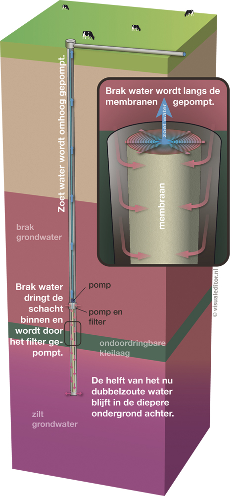 Een verticale ondergrondse osmosefilter voor drinkwater bespaart niet alleen veertig procent van de energie, het lijkt ook een krachtig wapen tegen de verzilting van het grondwater.