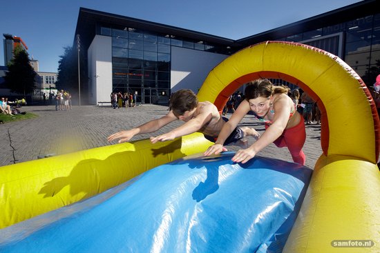 Het plein bij IO was woensdag één grote speeltuin voor studenten en medewerkers. Studievereniging i.d. organiseerde die dag Summercue, een vrolijk zomers evenement met spellen als buikschuiven en negerzoenwerpen.