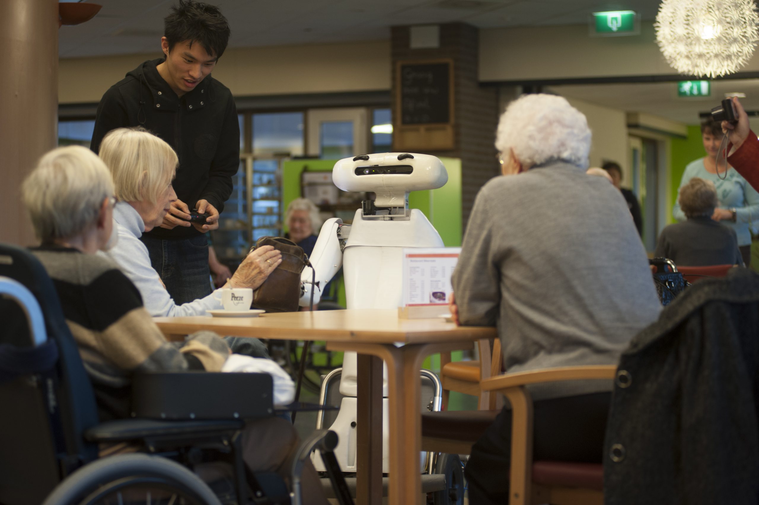 Zorgrobot Eva trok veel bekijks in het verpleegtehuis in Heemskerk waar onderzoeker dr.ir. Joost Broekens van het Delftse zorgrobotproject haar mee naartoe nam, drie dagen na de officiele opening van het TU Delft Robotics Institute op 25 januari.